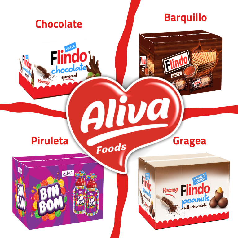 Aliva Foods es una empresa líder en la producción, fabricación y distribución de snacks y dulces de todo tipo, incluyendo galletas, cookies, dulces secos, piruletas, maní cubierto de chocolate, crispy con chocolate, barquillos y caramelos.
